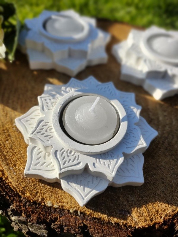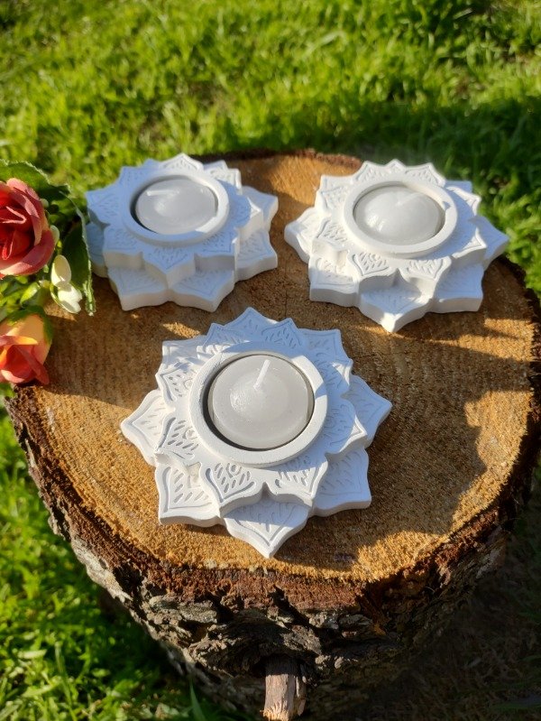 Hermoso portavelas de yeso. Incluye vela con tacita de metal