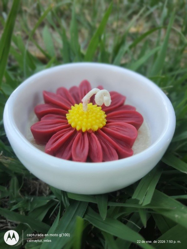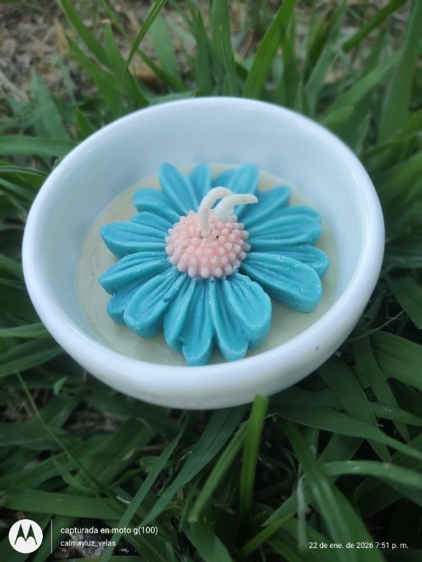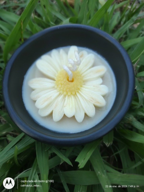 Hermosa vela en cuenco de cerámica. Detalle de margarita también en vela.